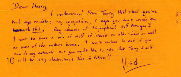 . . . I've always said you were the best artist in fandom on either side of the Atlantic from the earliest mimeo era. I still have a few VoMs with some of your stuff. I still marvel at and wonder how you persuaded that most difficult medium, the mimeo stencil, to give up even decent repro, let alone excellent.