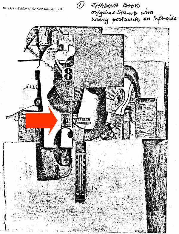 You know how it is when you suddenly notice an odd detail that has previously escaped you... It nags. It's there, blatantly on view, mocking you. So obvious that you marvel how you could possibly have overlooked it. Take the case of the Malevich Romanov stamp... A chance discovery that has become an obsession with me this past few years. I've tried to raise the matter with the owners of the painting concerned, written to an art historian who refers to the work in one of his books, buttonholed people I know in the philatelic field, but all to no avail. All my efforts to resolve the mystery have met with an apathetic silence. Obviously art historians are not interested in boring philatelic details, while philatelists are unconcerned about the niceties of art history. It began for me in 1989, the year there was a major showing of the work of the Russian painter Kasimir Severinovich Malevich in Amsterdam. The works held by the Stedelijk Museum there were supplemented by a generous loan of Malevich's paintings and drawings from Soviet sourcesthe Leningrad Russian Museum and Moscow Tretiakov galleriesand, lacking only a few masterpieces hoarded in American art museums, it was virtually a retrospective exhibition. Malevich was the painter who dominated the Russian avant-garde movement in the last years of Tsar Nicholas II, and during the revolution and civil war that followed. In that time he moved, logically and resolutely, through cubism and futurism toward total abstraction, reducing painting to pure form with his now-famous Black Square. Malevich continued to play an active part in the Soviet cultural front line of the twenties but fell into disfavour during the Stalinist years, when "formalist tendencies" were denounced and Socialist Realism was all. It was not until the late seventies that a change of stance by the authorities permitted a revival of interest in Malevich's art within the Soviet Union, and an unlocking of archival vaults. So the Amsterdam exhibition created an international stir. Unable to visit it, I obtained a copy of the lavishly illustrated catalogue, and relied on enthusiastic reports from a Dutch friend. He happens to edit the Journal of Russian Philately, for which I do production work. During an exchange of letters, he complained of the absence of his favourite Malevich canvasThe Knife Grinder of 1912. This comment prompted me to check on other American-owned works missing from the show. One of these, of particular interest to philatelists, is a painting-collage of 1914, titled Soldier of the First Division, from a series of cubist-inspired works that Malevich produced before venturing into total abstraction. The work currently hangs in the New York Museum of Modern Art and extends the ideas of Picasso and Braque's cubism of the period. Painted and actual objects are combined in a poetic proto-surrealist manner to evoke deeper meanings, with the images broken by large quadrilateral areas of flat pure colour that presage the sublimities of Malevich's suprematism. There are dissociated representational detailsa moustache, an ear, a medal, a bottlemixed with newspaper cuttings bearing words in Cyrillic ('OPERA', 'THURSDAY', 'TOBACCO POUCH', and the name 'A. VASNETSOV', an artist of an earlier generation) and two objects stuck to the canvas: a thermometer and, bang in the middle of the canvas, a used 7 kopeck stamp, one of the special issues of 1913 commemorating the tercentenary of the ruling Romanov dynasty, bearing a portrait of Nicholas II, destined to be the last of the Tsars. Over the years I've become familiar with several reproductions of Soldier of the First Division, but under the influence of my correspondence, I found myself viewing the illustrations a little more closely than heretofore. There is an excellent full-page monochrome print included in the study of Malevich by the Soviet art historian Larissa Zhadova, published in translation in East Germany in the late seventies, which shows the stamp to bear a heavy circular postal cancellation on the lefthand side. I mentally reviewed my library, convinced that I'd seen a full-colour reproduction somewhere.