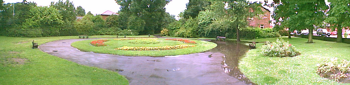 09: Hot June becomes soggy July This is the mini-park at the junction of Sandy Lane and Compstall Road after a torrential downpour. Drainage has never been one of Romiley's strong points, and the free swimming pool is filling up nicely. | |