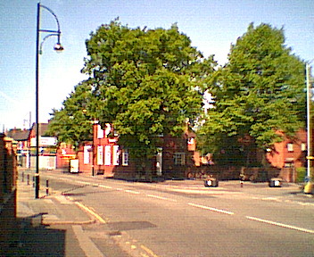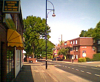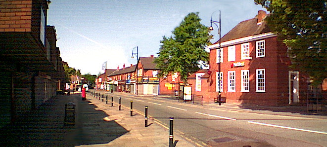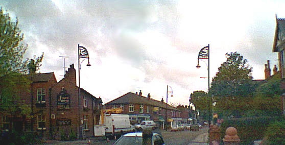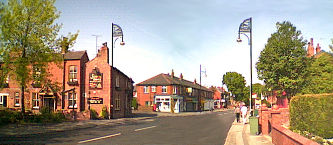 The painters have been and gone, the new lamp posts are now proudly black and gold, and the sun is shining on Romiley on a Bank Holiday Monday, which has to be something of a record. The apparent break in the white lines in the centre of the road is there because this is a composite of two pictures and two inconvenient cars parked in the foreground at the right side of the road were erased to improve continuity.