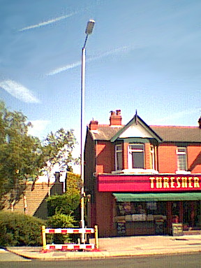 (Left :) The old lamp outside Threshers has a mini-trench around its base and a bit of a barrier to stop the customers falling into the hole. Looks like it's going to be absent some day soon -- although it still bears the Homewatch and No Parking signs and the hydrant information.