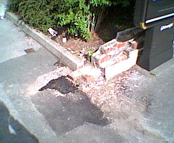A couple of weeks later : (right:) the old lamp was there on Sunday morning but it had vanished, along with the Home Watch and No Parking signs, and the fairly essential hydrant info, by the morning of Monday, 28th July. The darkest, freshest patch of tarmac at the end of the ruined wall marks the spot where it used to be.