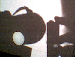 The two images shown above were produced using binoculars. The sun's image was projected into the shadow of the binoculars on a large piece of card. A large card was necessary because we didn't have a clamp and holding heavy binoculars steady is no easy job. The system is captured in the title picture at the top of the page, which shows the sun's image with Venus in transit on the shadow of the binoculars, and the shadow of the pen camera.