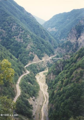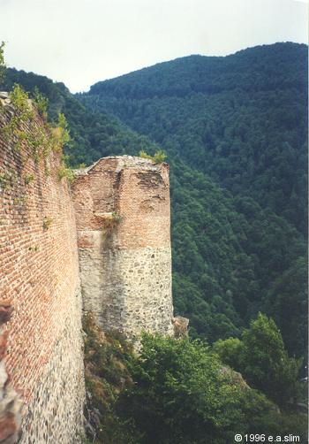 The gruesome story of the construction of this fortress is well documented. In 1457, Vlad Dracula invited the boyars (nobles) whom he held responsible for the death of his elder brother Mircea, to a feast in Tirgoviste. After his guest finished their meal Vlad's soldiers surrounded them, rounded up the able-bodies and marched them fifty miles up the Arges river to Poenari, where they were forced to build his mountain fortress. His prisoners laboured under very difficult conditions for many months. Those who survived the gruelling ordeal were impaled. For Vlad, its inaccessibility served well as a refuge from encroasing enemies, while its strategic location afforded advance warning of attack. To reach the fortress, you must climb about 1500 steps up the only accesible side of the mountain and cross a narrow wooden foot-bridge! The climb is worth the effort.The fortress is perched on the summit; it walls look like extensions of the side of the mountain. The view of the Arges gorge is breathtaking and the sense of history is overwhelming.