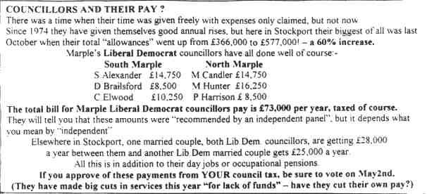 "What about the local Lib-Dem councillors who are also MPs? Can we really believe that the good people of our area are getting value for money from Councillor Andrew Stunnell, who is also MP for Hazel Grove? Or Councillor Patsy Carlton, who is also MP for Cheadle? It is a well known fact that people who try to do two jobs end up doing both of them badly. But if they're drawing a fat salary from the public purse, what do they care? As always, the people pay." |